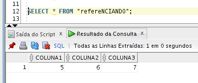 Após a criação das tabelas e as inserções, foram realizados consultas em ambas, pode ser notado que apenas 1 dos comandos inserts foi realmente inserido na tabela de nome "referenCIANDO", enquanto o banco de dados entende que sem aspas, REFERENCIANDO é igual referenciando ou qualquer outra combinação das letras entre maiúsculas e minúsculas.